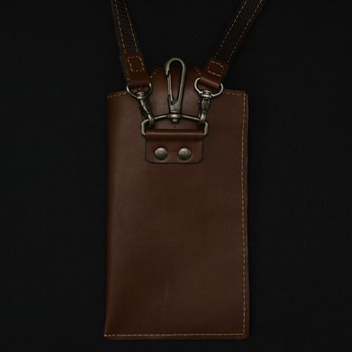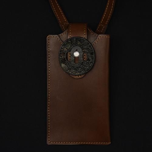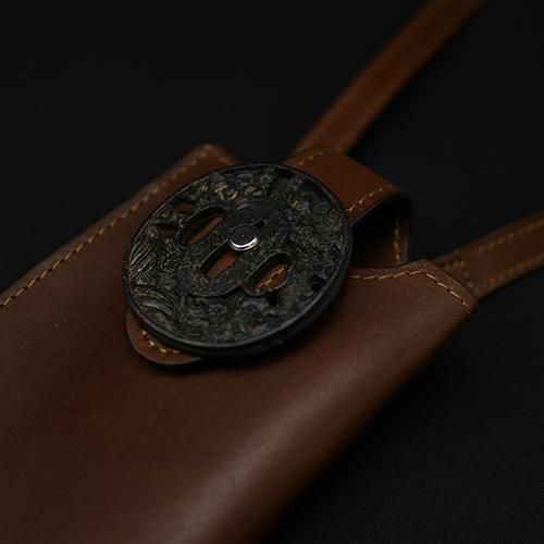 刀剣の鍔(プラスチック製)をポイントに使用した、当店オリジナル携帯ケースベルト付です。革職人が丁寧に手作りしております。