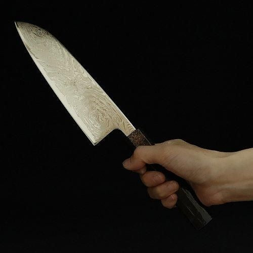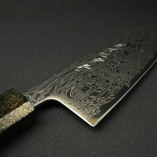 幾重にも重ねられたダマスカス鋼が織りなす美しい波紋模様が魅力で、中心には切れ味と耐久性に優れたAUS-10鋼(V金10号相当)を採用。職人の技が光る一本です。サビに強い特性を持つため、お手入れがしやすく、長期間にわたって清潔にご使用いただけます。毎日の調理を快適にサポートしてくれます。 漆塗りの八角柄は手にフィットし、滑りにくく、安定した持ち心地を実現。使うたびにしっくりと馴染む、温かみのある使い心地です。 見た目の美しさだけでなく、実用性にもこだわった設計となっており、料理初心者からプロの料理人まで幅広くご愛用いただいています。贈り物にも最適で、キッチンに一本あると安心の頼れる存在です。日々の料理が楽しくなるような使い心地をぜひお試しください。