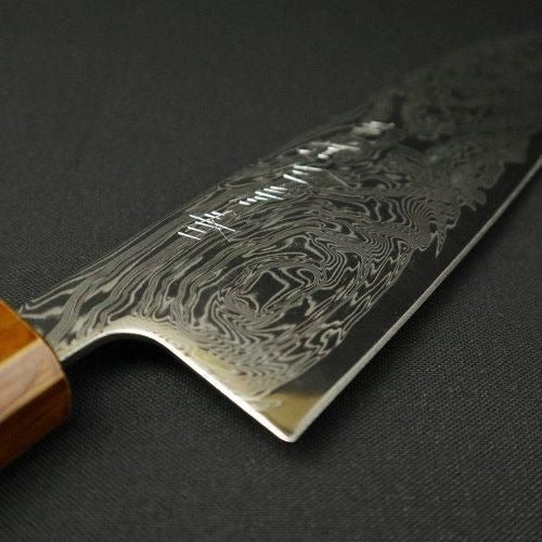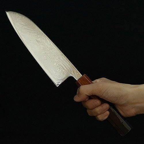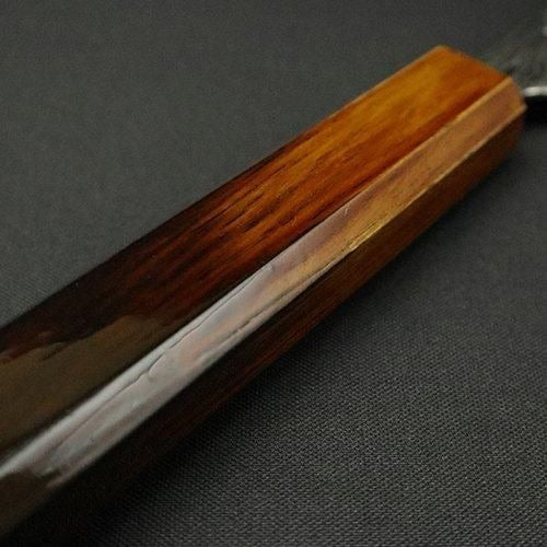 幾重にも重ねられたダマスカス鋼が織りなす美しい波紋模様が魅力で、中心には切れ味と耐久性に優れたAUS-10鋼(V金10号相当)を採用。職人の技が光る一本です。サビに強い特性を持つため、お手入れがしやすく、長期間にわたって清潔にご使用いただけます。毎日の調理を快適にサポートしてくれます。 漆塗りの八角柄は手にフィットし、滑りにくく、安定した持ち心地を実現。使うたびにしっくりと馴染む、温かみのある使い心地です。 見た目の美しさだけでなく、実用性にもこだわった設計となっており、料理初心者からプロの料理人まで幅広くご愛用いただいています。贈り物にも最適で、キッチンに一本あると安心の頼れる存在です。日々の料理が楽しくなるような使い心地をぜひお試しください。