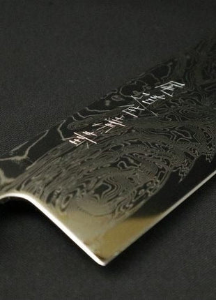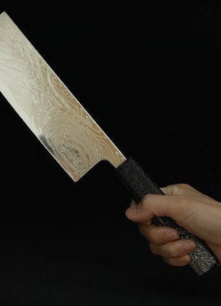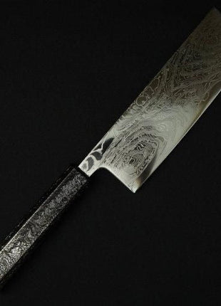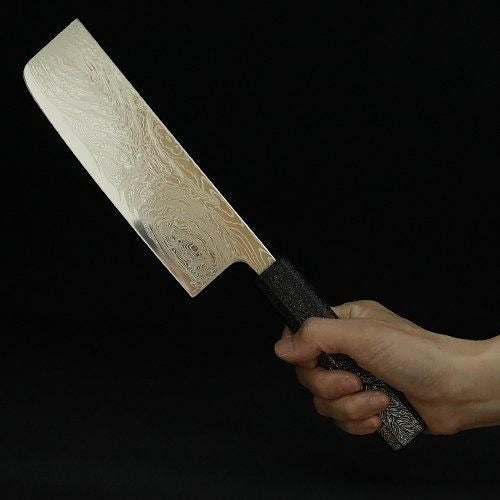 幾重にも重ねられたダマスカス鋼が織りなす美しい波紋模様が魅力で、中心には切れ味と耐久性に優れたAUS-10鋼(V金10号相当)を採用。職人の技が光る一本です。サビに強い特性を持つため、お手入れがしやすく、長期間にわたって清潔にご使用いただけます。毎日の調理を快適にサポートしてくれます。 漆塗りの八角柄は手にフィットし、滑りにくく、安定した持ち心地を実現。使うたびにしっくりと馴染む、温かみのある使い心地です。 見た目の美しさだけでなく、実用性にもこだわった設計となっており、料理初心者からプロの料理人まで幅広くご愛用いただいています。贈り物にも最適で、キッチンに一本あると安心の頼れる存在です。日々の料理が楽しくなるような使い心地をぜひお試しください。