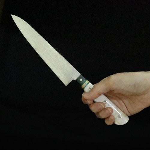 刃素材:V金10号 柄素材:グリーンマイカルタ、レインボー人工石、白の人工大理石